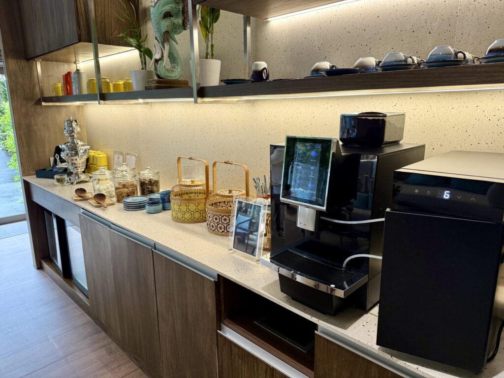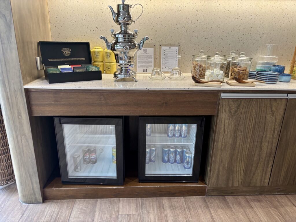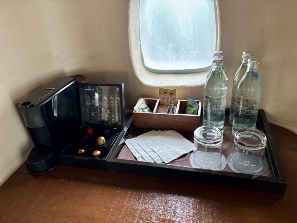 ミニバーはこんな感じで無料のカプセルコーヒーと紅茶、瓶に入った水