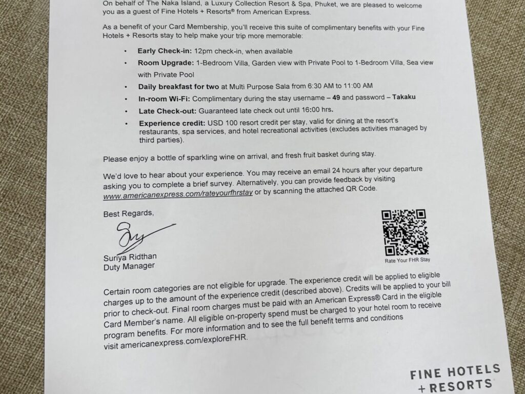 今回はFHR経由で予約したため、レイトチェックアウト16時まで、100ドルクレジット付、朝食無料でした!