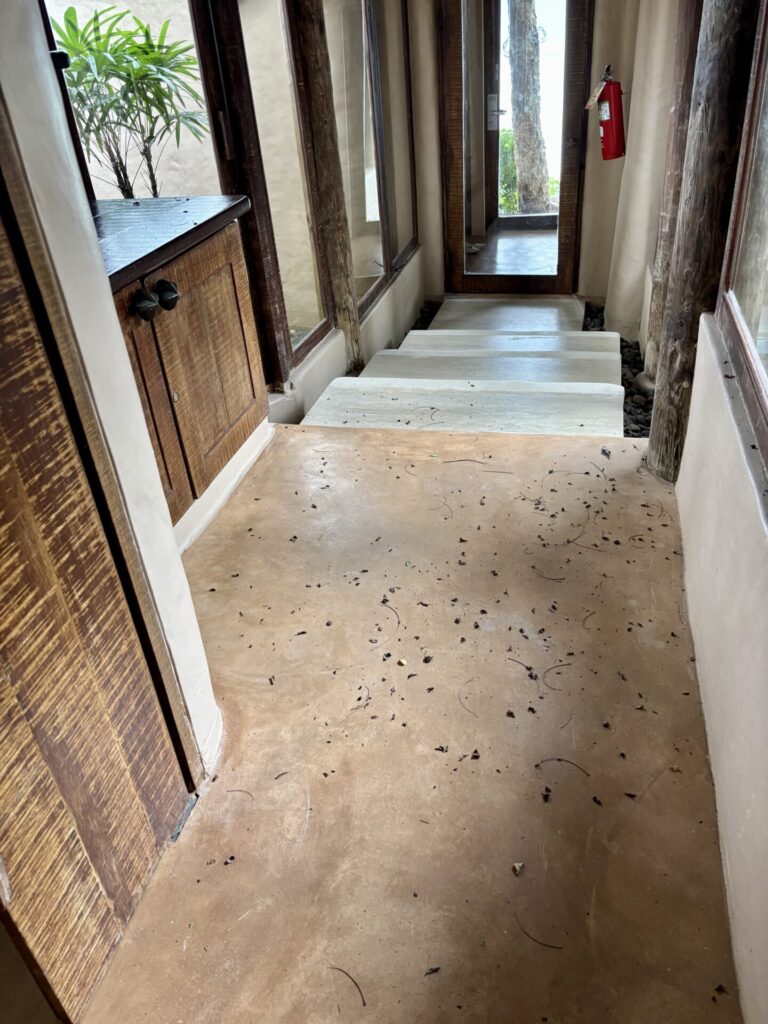 台風接近中でベッドルームとウェットルームを繋ぐ廊下はこのありさまで