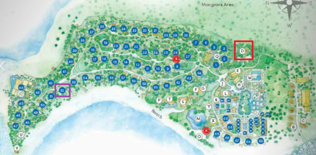朝食会場が赤枠のDで、お部屋は紫枠の52